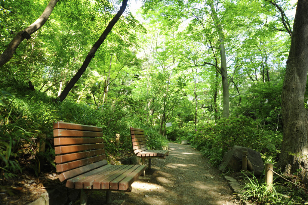 目白通りから少し南側に歩いていく。大通りから離れても変わらない空抜け。道幅は広く、家が隣接していない。どこにいても暗がりがなく、ほどよく明るい。そして公園、緑道だけでなく街の所々に木々が並び、全体として緑に包まれているような雰囲気がある。街の人に聞くと、野生のたぬきがいることもあるのだそう。小道に置かれたベンチに座ると、とても心が落ち着く。