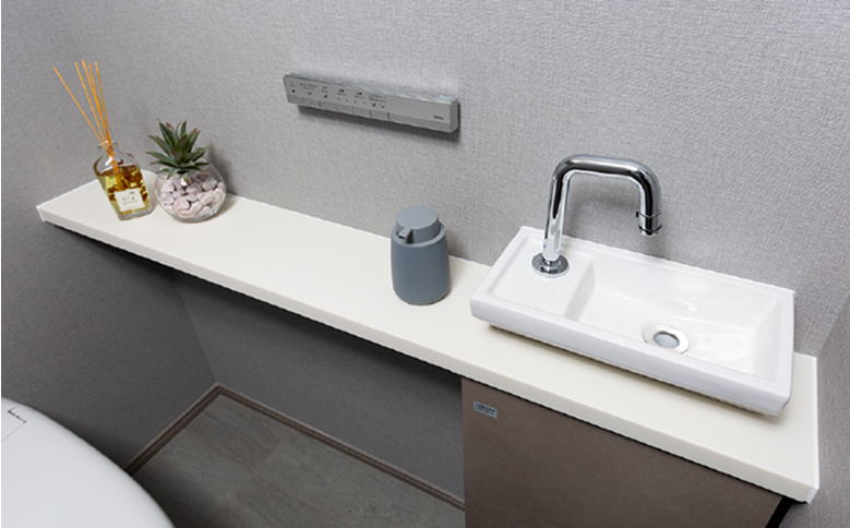 トイレ内に独立した手洗いカウンターを設置しました。小物の飾り棚としても利用できます。
