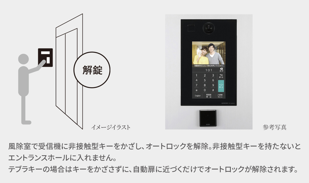 防犯性を向上させるため、「トリプルガード」防犯システムを採用しています。エントランス扉には非接触キーによるオートロックシステムを、エントランス階のエレベーター扉も非接触型キーによりロック制御。また、防犯カメラも設置して不審者の侵入をより困難なものにしています。