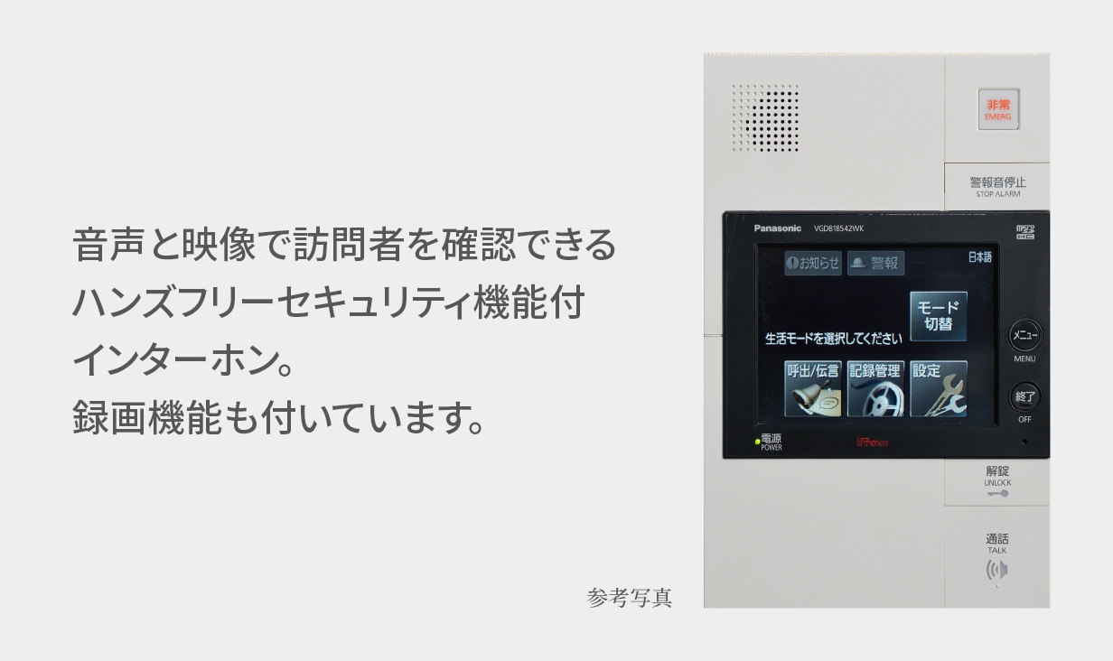 エントランスのオートロックシステムに対応して、リビング・ダイニングにはハンズフリーセキュリティ機能付インターホンを設置。画像と音声の両方で来訪者を確かめられます。ハンズフリーなので手が離せない時でも、受け答えがスムーズです。