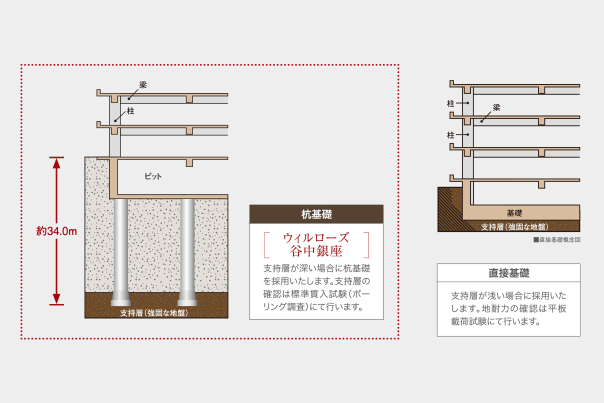 マンションの基礎は大きく分けて直接基礎と杭基礎の2種類があります。地盤調査の結果に基づいて工法および形状、深さを決定します。本物件では、現場造成コンクリート杭を採用しています。