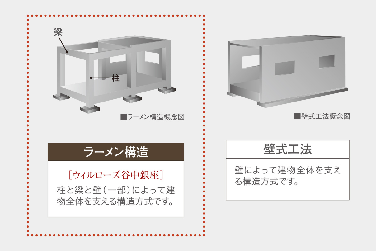 地震大国である日本において建物を建てる場合に、建物の耐震性の確保は非常に重要な課題です。まず地盤調査をしっかりと行い、その後、どのような建物構造がふさわしいかを確認した上で、建物構造を設計します。本物件は、柱と梁と壁(一部)で建物を支えるラーメン構造を採用しています。