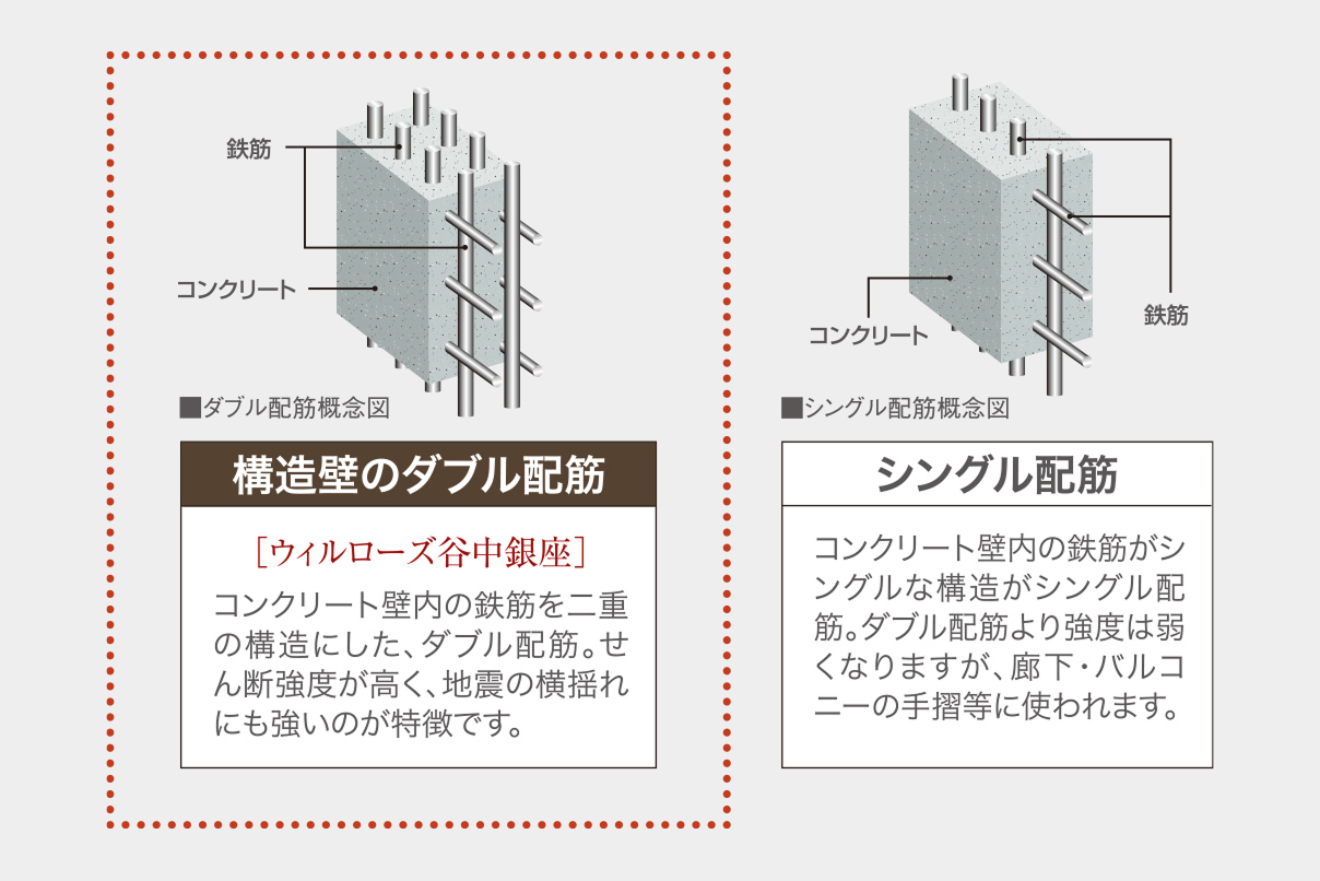 同じ鉄筋コンクリート造のマンションでも、その構造には違いがあり、強度や耐久性のレベルも異なります。本物件では、構造壁の鉄筋を二重に組むダブル配筋を標準として施工しています。ダブル配筋は、シングル配筋よりも高い強度と耐久性があります。