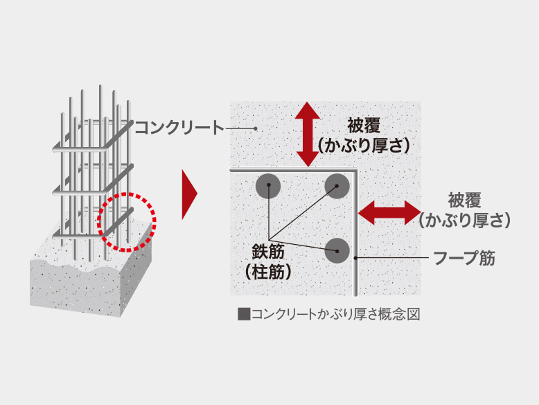 鉄筋を覆うコンクリートの厚さのことをかぶり厚さといいます。コンクリートはアルカリ性であるため、中性化が進むと、中の鉄筋が錆びやすくなります。これを防ぐひとつの策として、このかぶり厚さを厚くすることでコンクリートの中性化を遅らせ耐久性を高める効果があります。建築基準法上で規定された最小かぶり厚さに10㎜加えたものを設計かぶり厚さとし、鉄筋の中性化防止対策としています。中性化とは強アルカリ性であるコンクリートが鉄筋の酸化による錆びを防いでいる状態から、次第に雨や大気中の二酸化炭素等の影響によって鉄筋の腐食に対する保護作用を失うことをいいます。